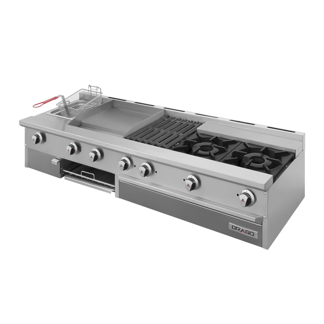 • 2 quemadores tipo cupula en hierro fundido de 30,000 BTU c/u.